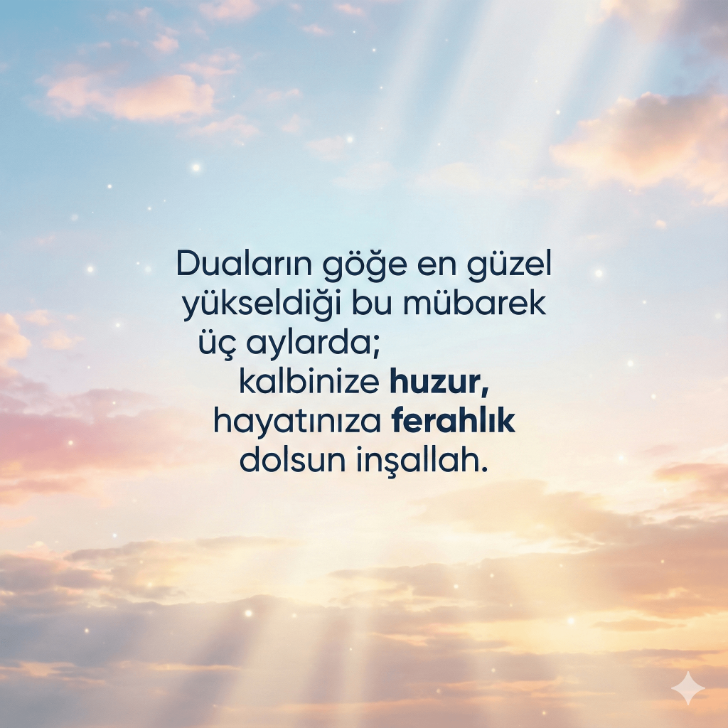 Mübarek Üç Aylar, manevi olarak yenilenmek, dualarla arınmak ve sevdiklerimizle gönül bağını güçlendirmek için çok özel bir zaman dilimi… Recep, Şaban ve Ramazan aylarını kapsayan bu mübarek dönemde, sevdiklerine anlamlı sözler göndermek istiyorsan, doğru yerdesin. Bu sayfada, sosyal medyada paylaşabileceğin, WhatsApp veya diğer uygulamalardan kolayca iletebileceğin en güzel Üç Aylar mesajları bir araya getirildi.